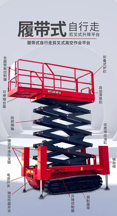 自行式履帶升降機也可叫做履帶式升降平臺,自走式履帶升降機,履帶式升降機是根據當今市場環境所造就的一款新型升降機,履帶式升降機區別于常見的輪式升降機,外形好像履帶式裝甲車,霸氣側漏,是一款室外復雜環境使用的肌肉型升降機